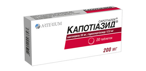 1 tablet contains captopril in terms of 100% of the substance – 50 mg, hydrochlorothiazide in terms of 100% of the substance – 12,5 mg.